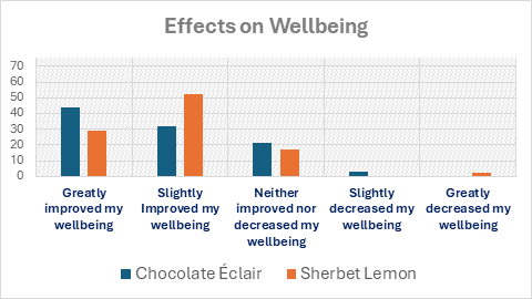 A slightly higher proportion (81%) of those who selected a sherbet lemon reported improvements in wellbeing (slightly improved or greatly improved) compared to those who selected a chocolate éclair (76%). Wellbeing decreased in two participants (3%), one reporting a great decrease in wellbeing after consuming a sherbet lemon and the other reporting a slight decrease in wellbeing after consuming a chocolate éclair. For each type of sweet, 7 participants (9%) reported no change in wellbeing.